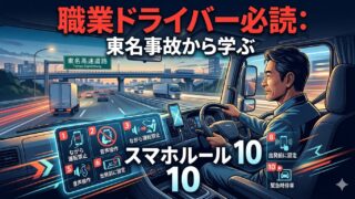 交通安全,ドライバー向け,企業安全管理,事故防止,運行管理 職業ドライバー必読:東名事故から学ぶスマホルール10 東名・新名神の多重事故報道を踏まえ、スマホ関与リスクと再発防止策を徹底解説。職業ドライバーが現場で即実行できるスマホ運用ルール10と企業向けチェックリスト、事故時の初動対応と証拠保全の手順まで網羅。 2026.04.09 交通安全,ドライバー向け,企業安全管理,事故防止,運行管理
