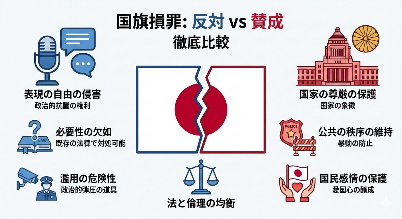 国旗損壊罪の法的背景と現行法の有無、賛成派と反対派の主張を整理し、海外の事例や運用上の課題、代替案までを比較検討して結論的な提言を行います。