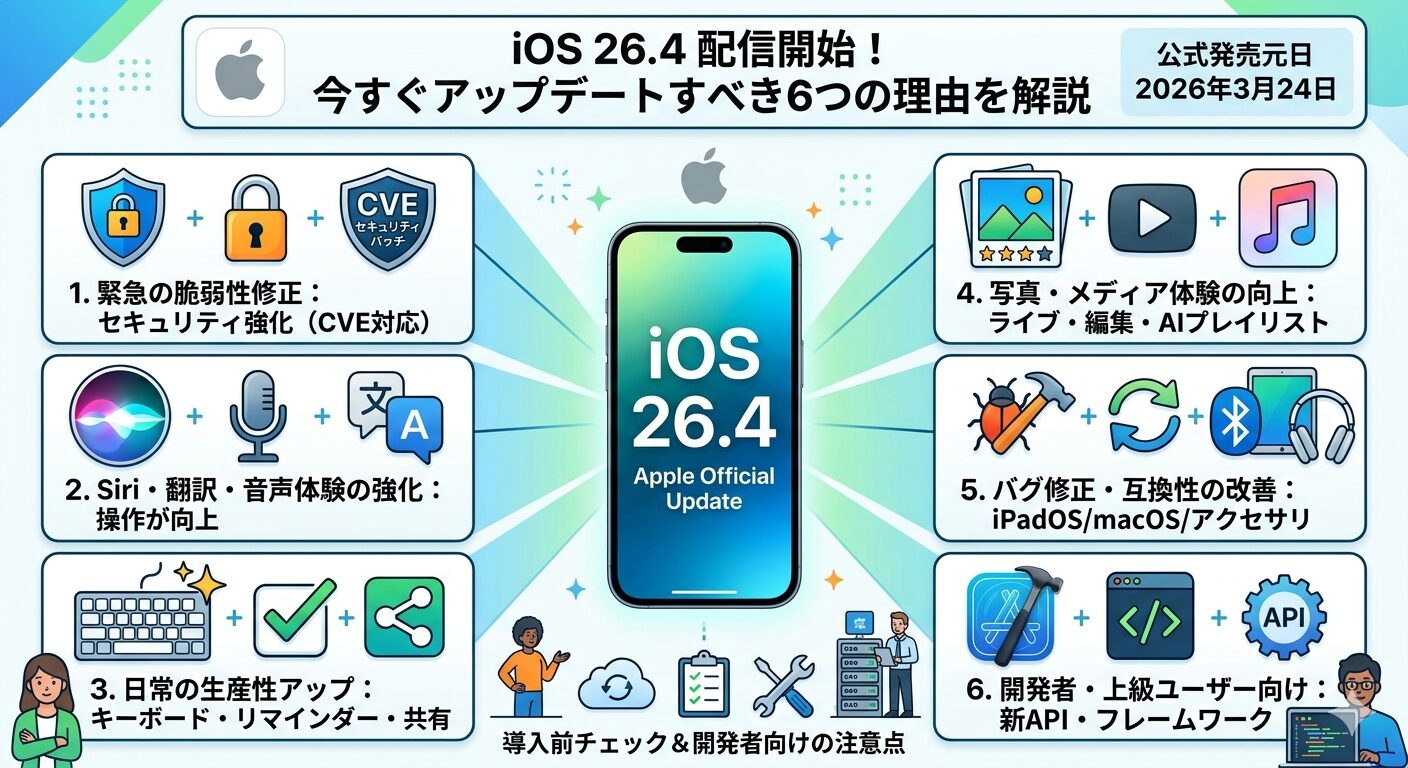 Appleが配信を開始したiOS 26.4の概要と注目ポイントをわかりやすく整理し、なぜ今すぐアップデートすべきかを6つの理由で解説します。