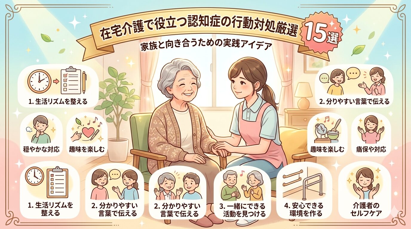 ここからは在宅介護で即実践できる具体的な行動対処を厳選して15項目提示し、環境調整、言葉かけ、日常リズムの整備、運動や感覚刺激、薬の管理、専門家連携まで幅広く解説するので、優先順位をつけて家庭で取り入れてみてください。